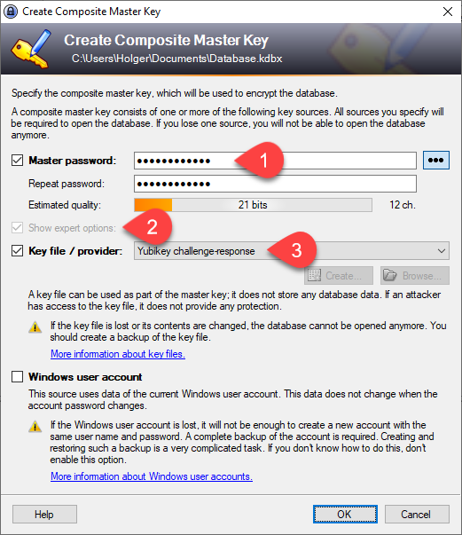 Das Hauptproblem besteht im Schutz des Tresors - wenn er geknackt wird, sind alles Ihre Kennwörter mit einem Schlag unsicher. Aber natürlich möchte sich niemand für den Tresor ein 20 Zeichen langes, aus zufälligen Zeichen generiertes Kennwort merken. Zum Glück gibt es auch hierfür eine Lösung mit Keepass. Zum einen können Sie Ihre Datenbank durch Ihr Windows-Benutzerkonto schützen. Keepass verwendet dann in Windows integrierte Mechanismen (DPAPI), um das Kennwort der Datenbank abzusichern. Diesen Mechanismus können Sie mit einem Kennwort kombinieren, um mehrer Faktoren gemeinsam zur Authentifizierung zu benutzen. Man spricht dann von Zwei- oder Multifaktor-Authentifzierung (MFA). Leider hilft das nicht weiter, wenn Sie Ihre Datenbank auch auf Ihren Mobilgeräten mit Android oder iOS verwenden möchten. Alternativ können Sie ein Schlüsselfile (eine Datei, die einen zusätzlichen Schlüssel enthält) verwenden. Wenn Sie diese Datei aber über einen Datei-Synchronisationsdienst mitsynchronisieren, ist das, als würden Sie Ihren Schlüssel unter die Haustürmatte legen. Sie können das Schlüsselfile natürlich auf einem USB-Datenträger ablegen, aber den bekommen Sie nur mit Schmerzen an Ihr Mobilgerät.