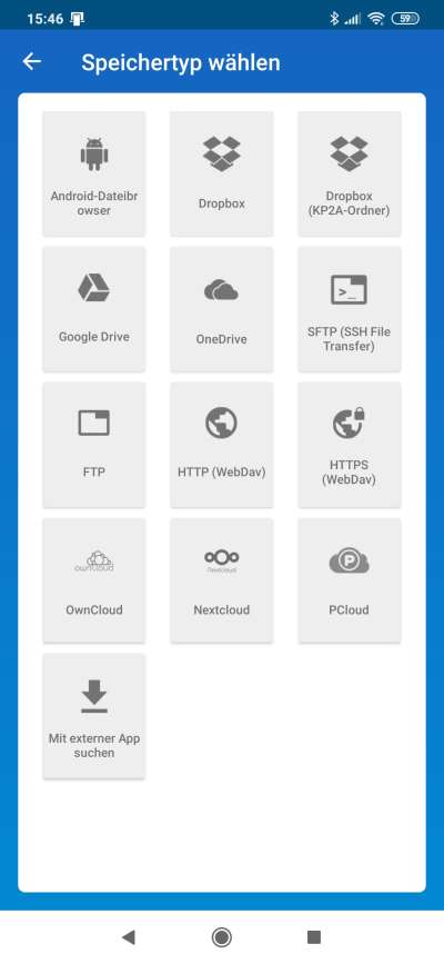 Nun können Sie Keepass2Android starten und eine Datenbank öffnen. Sie können dann einen der vielen Filesharing-Provider auswählen, die Keepass2Android von Haus aus unterstützt.