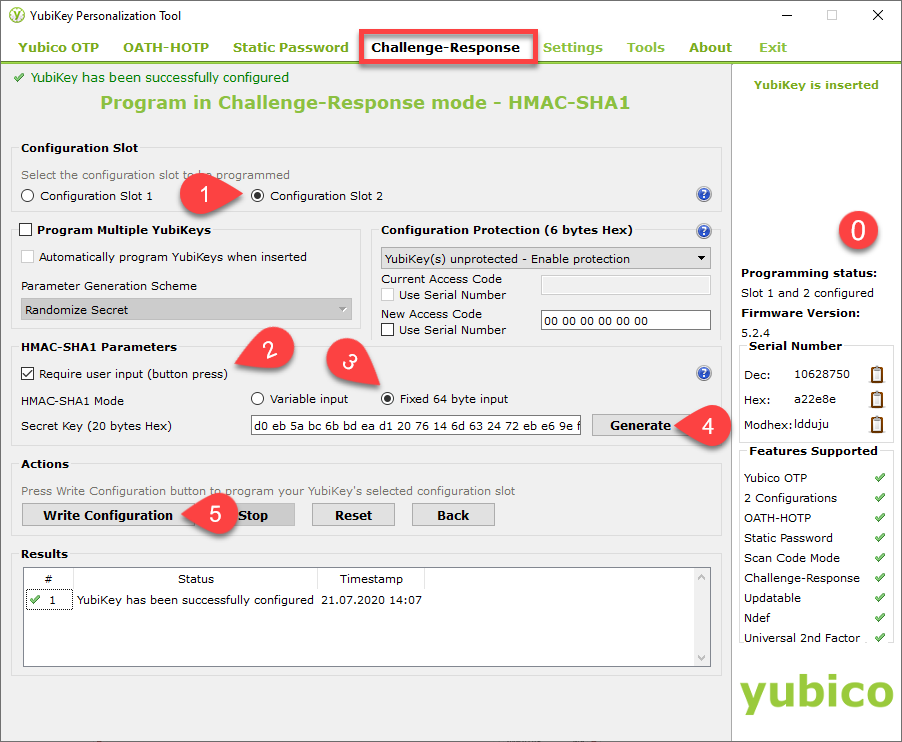 Installieren Sie das Tool, und wählen Sie im Menü "Challenge-Response" aus. Für die Authentifizierung stehen zwei Methoden zur Verfügung - ein OTP (One Time Password), wie es z.B. die Google- oder Micrsoft-Authenticator-Apps generieren - oder die "HMAC-SHA1" Challenge Handshake Response Methode.