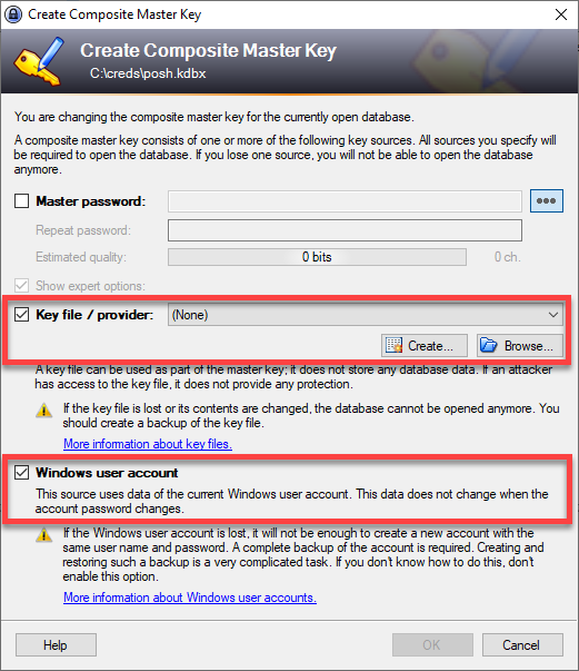 Wenn Sie eine Datenbank mit Schlüsseldatei erzeugen möchten, müssen Sie die GUI von KeePass bemühen. Starten Sie dafür KeePass und öffnen die neu erstellte Datenbank über "FIle > Open". Alternativ können Sie über "File > New" die Datenbank auch direkt hier erstellen. Anschließend wählen Sie "File > Chang Masterkey" und aktivieren die Checkbox "Show Expert Options". Entfernen Sie den Haken bei "Master Password", setzen Sie den Haken bei "Windows User Account" und "Key file / provider" wählen Sie den Button "Create".
