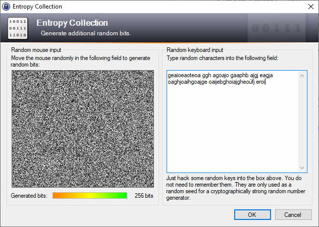 Als nächstes geben Sie den Pfad für die Schlüsseldatei an. Die Schlüsseldatei enthält ein zufällig generiertes Kennwort. Um echten "Zufall" zu generieren, müssen Sie Text eingeben und die Maus über ein "White Noise"-Bild bewegen.