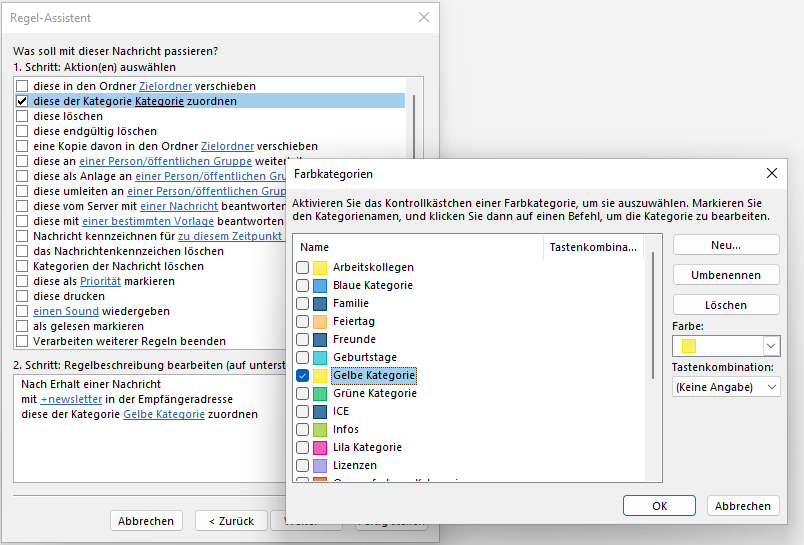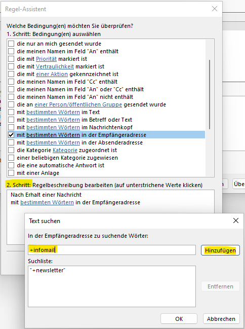 Die Regel wird jetzt von Outlook angewendet. Sie können die Regel einfach testen, indem Sie eine mail an sich selbst schicken, aber als Empfänger +newsletter an Ihren Namen anhängen. Da es sich um eine Mail-Markierung und nicht um eine neue Email-Adresse handelt, können Sie mit der Plus-Adressierung keine Mails verschicken, sondern lediglich Mails empfangen!