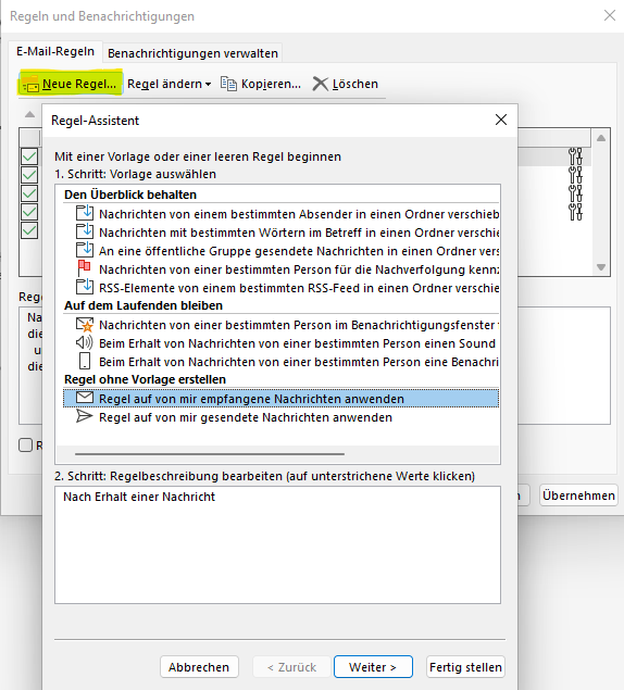 Um die Plus-Adressierung zu nutzen, hängen Sie einfach hinter Ihren Empfänger-Namen (vor dem @) ein + gefolgt von einem beliebigen, selbstgewählten Text an, z.B. info+newsletter@netz-weise.xyz. Mails an diese Adresse werden vom Exchange-Server ganz normal an info@netz-weise.xyz zugestellt, der Mail-Client sieht im Posteingang aber die vollständige Adresse info+newsletter@netz-weise.xyz. Auf Basis dieses Namens können Sie jetzt Regeln einrichten. In Outlook wechseln Sie hierzu ins Datei-Menü, wählen "Regeln und Benachrichtigungen verwalten" aus und erstellen eine neu Regel in der Kategorie "Regel ohne Vorlage erstellen".
