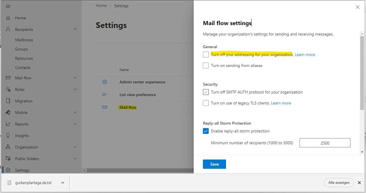 Die Exchange-Plus-Adressierung ist im Office 365 seit Mai 2022 automatisch aktiviert. Soweit mir bekannt, ist die Plus-Adressierung für lokal betriebene Exchange-Server nicht geplant. Wenn Sie die Plus-Adressierung nicht unterstützen wollen, können Sie sie im Settings-Menü des Exchange-Admin Portal deaktivieren. In den Mail-Flow-Einstellungen finden Sie als ersten Eintrag "Turn off plus adressing for your organization".